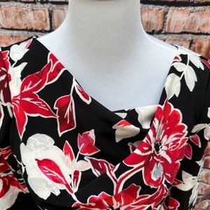 Scoop Neck • 3-4 Sleeve • Knee Length • Floral • Ruched • 33.5" Chest, 39.0" Length • 85% Polyester, 15% Spandex