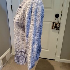 White House Black Market Light blue fringed jacket. Size small. Length from top of neck to bottom, including fringed is 23"
