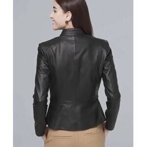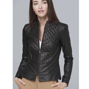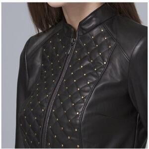This butter-soft leather jacket—with an ultra-femme shape—is punctuated by petite golden studs dotting its quilted front panel. Fully lined, two-way zipper, and stand collar.