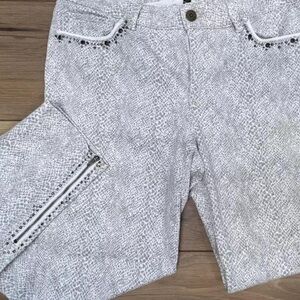 White House Black Market Gray & White Snakeskin Print Zipper Ankle Crop Jeans Size 8. Rivets and cording around pockets and zippered leg openings. Approximate measurements in photos. Excellent condition.