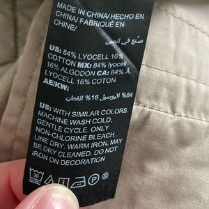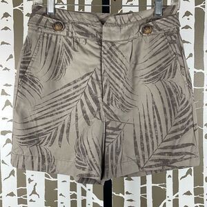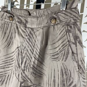 Additional Details: Super soft fluid fabric, tropical palm frond/leaf print, button/tab side accents at waist, fully functional front and back pockets (still sewn shut).