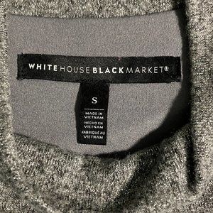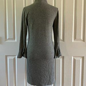 Dressy gray w silver thread dress with long, fluted sleeves. Soft fabric and smooth fit; no zipper, buttons, or snaps; fully lined. Wear with black boots or patent leather pumps.