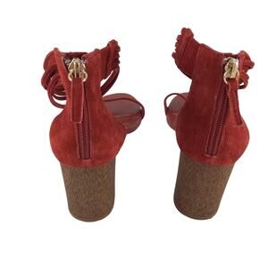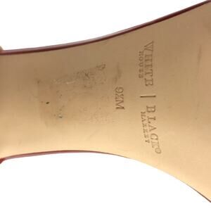 WHBM Larissa Burgundy Open Toe Heels Back Zipper Detail with gold accents