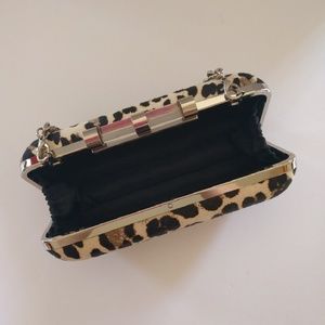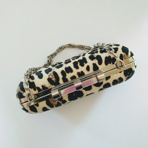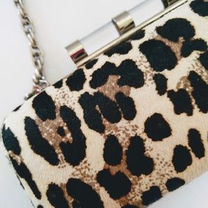 WHBM Leopard Pill Box Clutch is genuine calf hair. Silver chain detail is detachable. This clutch is ADORABLE! Very gently used and well-loved.