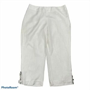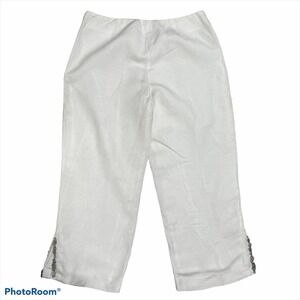 Fully lined, linen blend white cropped pants with shell lined slits at each leg hem. Hidden zipper on side for easy on/off.