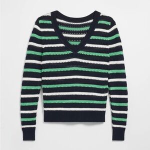 Add some playfulness to your wardrobe with this nautical-inspired sweater. Horizontally striped with a V-neckline, it features long sleeves, a beautiful crochet stitch, and ribbed bottom and cuffs. Team yours with wide-leg denim and embellished flats.