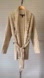 WHBM.. Long cardigan with fringe trim, belt and metallic logo Heather Biscotti