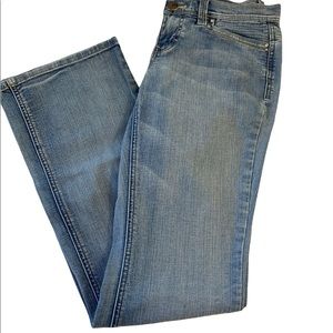 WHBM, NOIR, superstar light wash, bootleg jeans. Butterfly back pockets have buttons.
