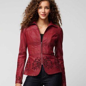 WHBM NWT Cutwork Coated Denim Flirty Jacket Dark Red LEATHER LOOK
