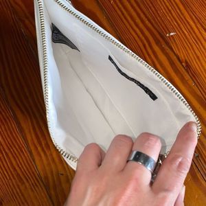 Has a main zip compartment that houses a single slide pocket and has an outer slide pocket as well. Detachable wristlet strap.
