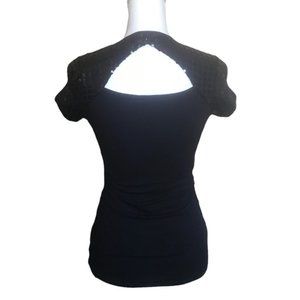 Navy blue scoop neck short sleeve stretch tee with square sequin detailing and back cut out.