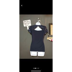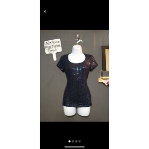 White House Black market, Navy blue, sequined front, open back top. Size small. see pictures for measurements from pit to pit. comes from a clean environment and is in excellent used condition. Material is stretchy.