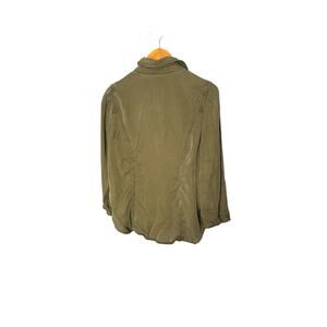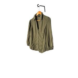 White House Black Market, WHBM, Lyocell, Tencel, Blouse, Button Down, Button-Front, Shirt, Top, Olive Green, Khaki, Military Green, Size 12, Puff Sleeve, Gathered Sleeve, Ruched Sleeve, V-Neck, Business Casual, Workwear, Professional, Career, Tunic, Drape, Soft, Fluid, Spring, Summer, Fall, Winter, Versatile.