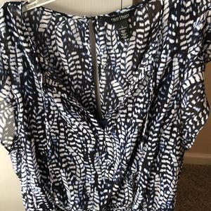 Navy and white patterned sheer overlay on navy slip. Half skirt lined. Front left slit in skirt. Cap sleeves. Elastic at waist. Styled with a belt to create structure. Worn once