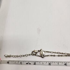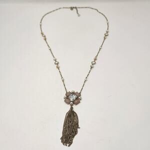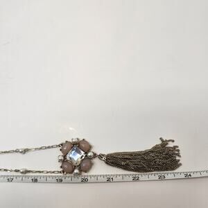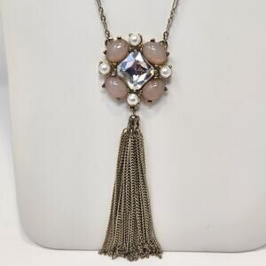 White House Black Market WHBM long necklace with iridescent pink and clear rhinestone cluster pendant with metal tassel, gold tone chain, glass bead and faux pearl accents, lobster clasp closure with extender chain. Signed Costume Jewelry Sweet Romantic Statement Workwear Party Going Out