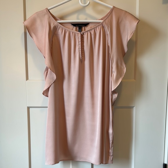 This elegant pink blouse from White House Black Market features charming ruffled sleeves that add a touch of femininity to its design. Crafted from a soft, lightweight fabric, it offers a comfortable and stylish fit. The blouse's relaxed silhouette makes it a versatile addition to any wardrobe. Excellent used condition. Only worn twice.