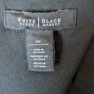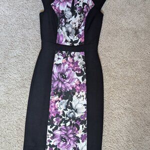 Black dress with purple floral panel from WHITE HOUSE BLACK MARKET. Lined. Hidden back zip with hook-and-eye closure.