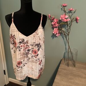 Chic plaid spaghetti strap top perfect for casual outings. Just turn it inside out and you have a completely new look with a stunning delicate floral pattern of soft pinks, creams, and greens. Like new condition, 21.5” from arm pit to arm pit, 25” from top of shoulder to hem. The tag is reversible as well depending on what mood you’re in!! This two outfits in one cami is a great addition to any wardrobe!
