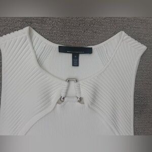 A modern twist on an everyday tank, this one features elevated silver hardware at center front with cutouts, to make it a playful style. It's ribbed, sleeveless, and great for layering.