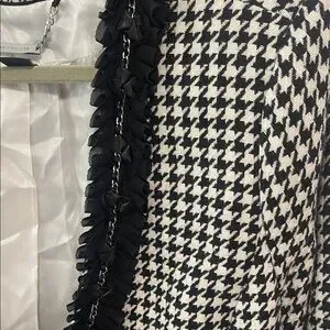 This jacket is so fun!! It features a bold houndstooth pattern with a border ruffle. Chains and bows accent the ruffles. Full of sass!!
