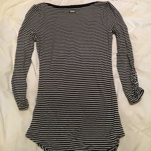 3/4 length sleeves black and white striped top with a v cut with rhinestone embellished buttons rushed sides xxs