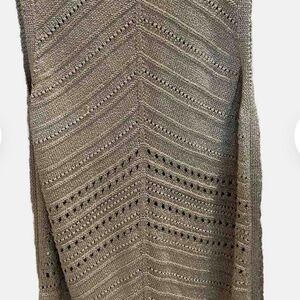 Effortlessly stylish this open knit sleeveless knit tank will smoothly transition you from day to night with a switch of shoes and accessories. Features open weave chevron knit design in a allover metallic threading, pullover styling, v neck silhouette, split hem in a slight hi lo design, contrast ribbing hemline and neckline.