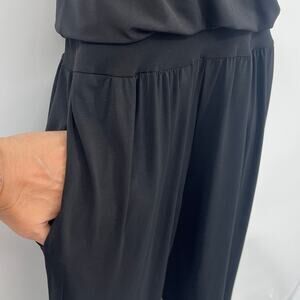 White House Black Market, WHBM, black jumpsuit, sleeveless jumpsuit, surplice V-neck, wrap style, metallic trim, cocktail jumpsuit, keyhole back, evening wear, mob wife, cocktail core, party outfit, date night, chic jumpsuit, sophisticated, elegant, minimalist, modern glam, night out, Vamp, sexy