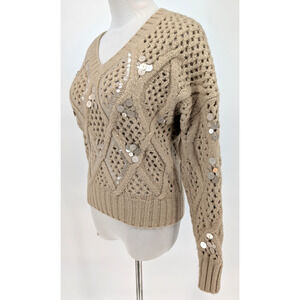 WHBM Sequin Cable Knit Sweater Beige Chunky Embellished Cozy Glam XS Holiday