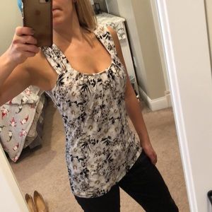 Neutral colored shell top with a tropical hibiscus print, scoop neck top, and silver detailing in the front. Like new condition, worn and washed twice. I have an abundance of summer tops so looking for a new home for this one. Pairs well with black skinny Jean crops or a pencil skirt with espadrilles or pumps.