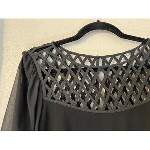 This pretty dress is from White House Black Market in a misses size 10. Solid jet black in color. Top section has cut out lattice type trim. Fully lined (has a silky feel). Outer fabric is pure polyester. Machine washable. Has a smooth fit with back zipper. Sheer sleeves.