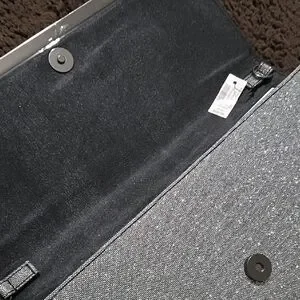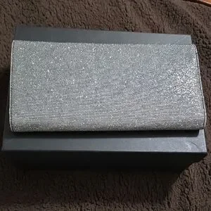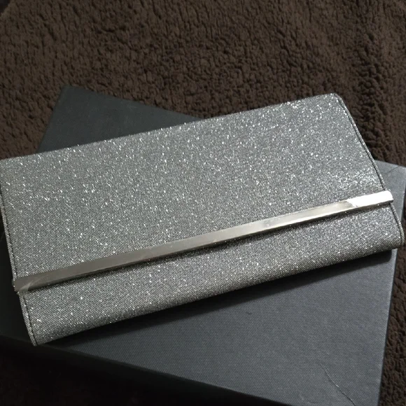 Sparkling silver glitter clutch. Slim envelope silhouette with a polished metallic trim. Elegant for evening events and parties. still has protective plastic coating on handle.