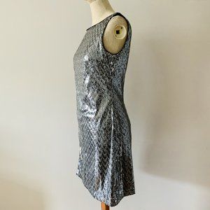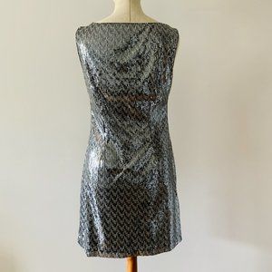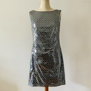 Sparkling sequins in mixed silver and blue metallic cover this sleek shift dress in a slightly zig zag pattern that is sure to please.