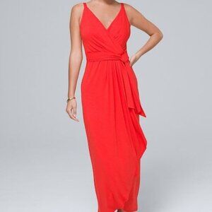 This gorgeous dress by WHBM features a v-neckline, adjustable shoulder straps, a draped front, with a wrap style tie-belt. Fabric is a great quality jersey knit with stretch. Fully lined. Color is "Deep Coral" and looks like a coral-red in person.
