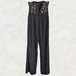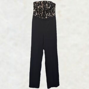 WHBM Strapless Lace Bodice Straight Leg Jumpsuit Side Pockets Black Nude sz 10