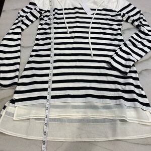 White House Black Market long sleeve stripes hoodie in size XS. Ecru with black stripes, sheer trim at bottom. Super soft and lightweight.