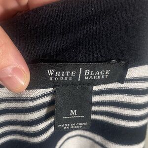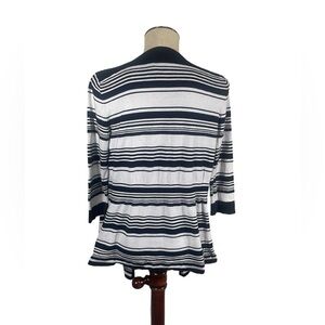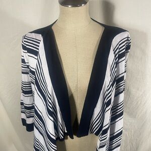 Black/white stripe cardigan from WHBM is a lightweight knit and features a cascading open front, 3/4 length sleeves, and rubbing in back for shaping. 100% cotton. Machine wash.
