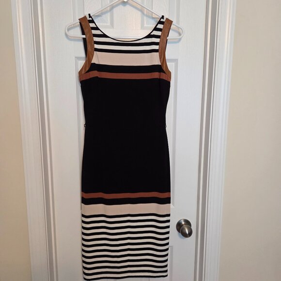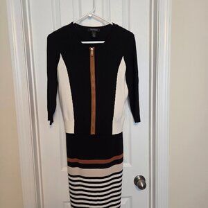 Chic sleeveless midi dress is soft and luxurious with black and brown stripes. Faux leather accents & belt ( the belt is pealing so please refer to pics). Matching jacket with faux leather accents on the zipper.