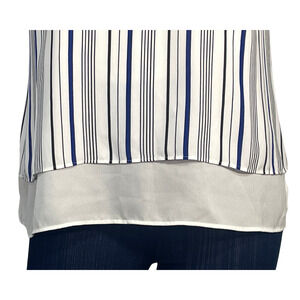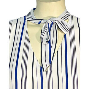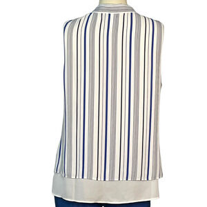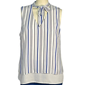 WHBM Sz M Tie Bow Neckline Sleeveless Shell Top Layered Chiffon Blue Stripes