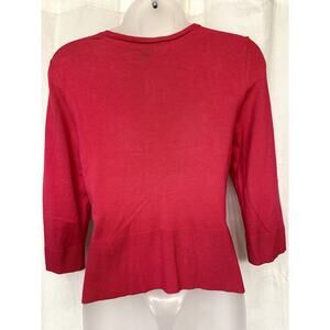 This WHBM hot pink cardigan sweater features delicate fabric rosettes on the front, adding a romantic and feminine touch. The silver domed snaps down the placket add a touch of elegance. Elbow-length sleeves and soft, stretchy fabric make it comfortable and flattering.