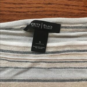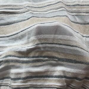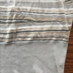 In great condition. Grey silver and tan colored stripes. Also has a metallic sparkle hue tot he material. Has a slit on the bottom of the sleeves. (S)