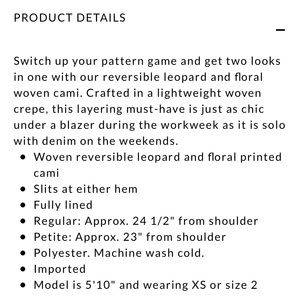 WHBM reversible tank top. Cheetah print on one side, floral print on the other. In great condition, it just doesn’t fit anymore. I absolutely adore it.