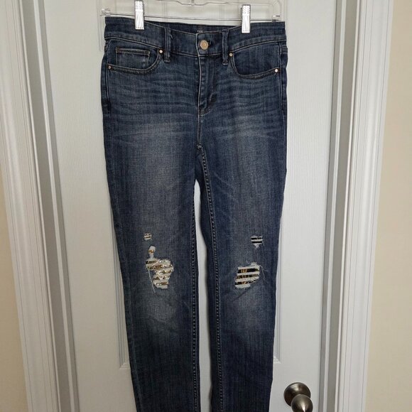 WHBM The Slim Distressed Jeans in a factory faded blue denim with metallic and black insets and deconstructed hem. Size 0. Five pocket design.