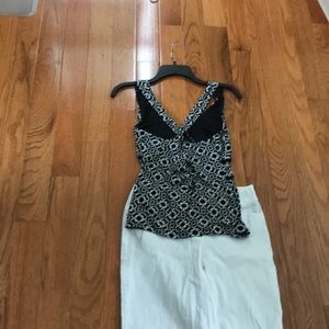 WHBM black and white scroll print cross cross back top. Dress it up with black/white pants, jeans or down with shorts and flip flops. In great condition and perfect for the summer from a smoke and pet free home.