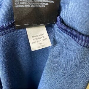 Dark blue surplice top, tie waist. Silver rectangular hardware on straps.