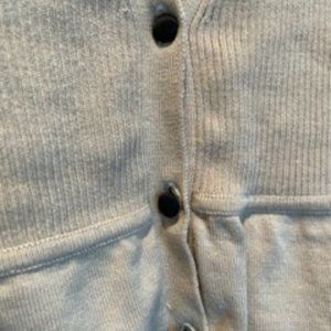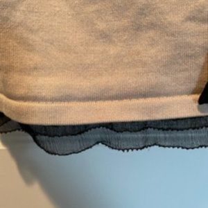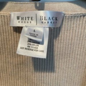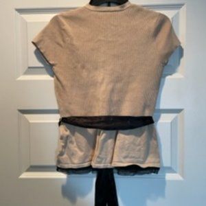 White House Black Market size Large, cream colored V-Neck top with black detail trim and satin belt. 56% silk, 24% cotton, 20% nylon. Smoke-free, pet-free home