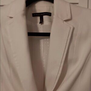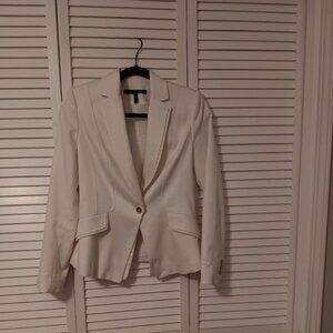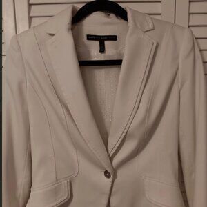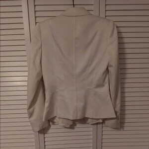 Structured style with unique details. Shoulder pads, slated front pocket panels (no pockets). Single (silver) button closure.