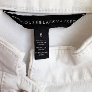 WHBM field jacket in white, featuring a mandarin-style collar, silver button-down closuret,