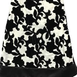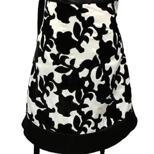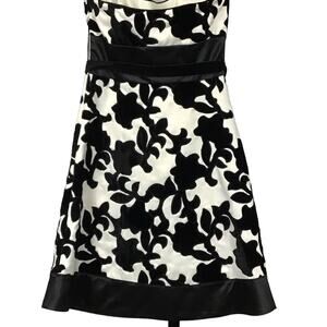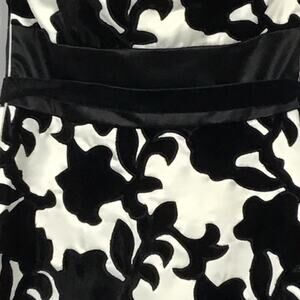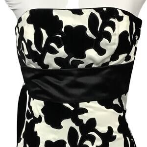 WHBM White House Black Market Strapless Satin Velvet Black White Mini Dress sz 0. Gorgeous cocktail, homecoming, prom or party dress by White House Black Market. Beautiful white satin with velvet floral trellis embroidered, black satin waistband and hem, self fabric belt. Side seam zip, boning for shape, darts for shaping, tailored seaming. Fully lined. Perfect and in brand new condition!