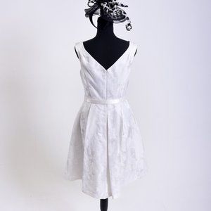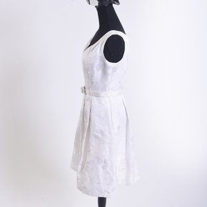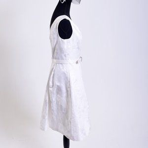White House Black Market original , unique design. Tailored White dress with flared skirt at the waist w/matching belt...and POCKETS! Unique Brocade design pattern. Gently worn and in Excellent Condition.