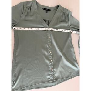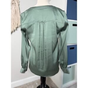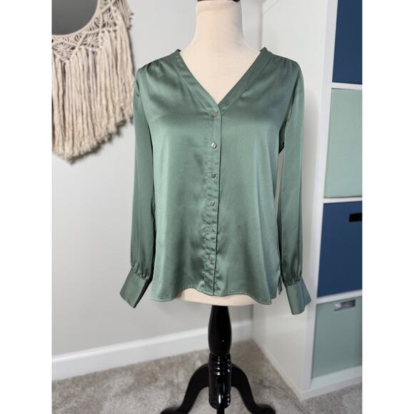 WHBM White House Black Market Women's Sage Green Satin V-neck Silver button-up Shirt Blouse Top XS Holiday Glam Xmas